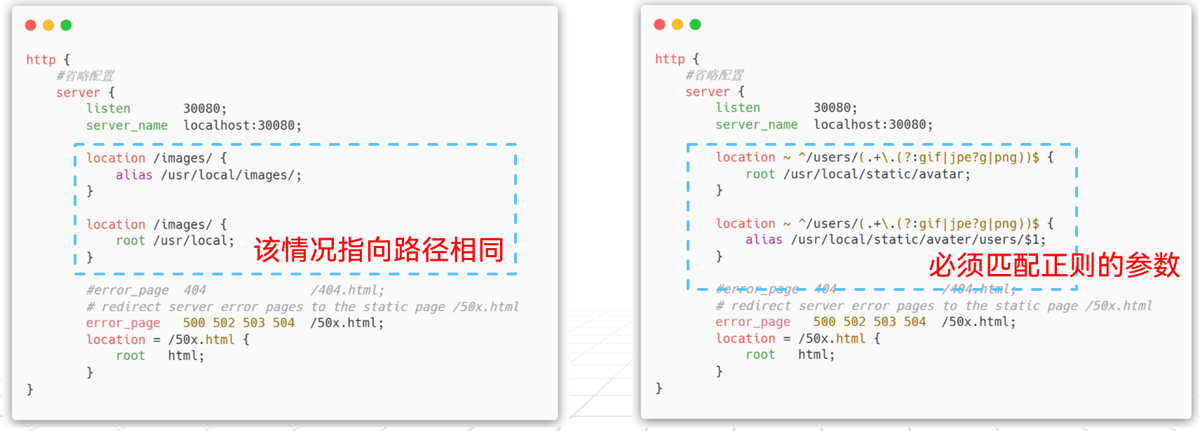 alias只能作用在location中;而root可以存在server、http和location中,且会影响其他块。