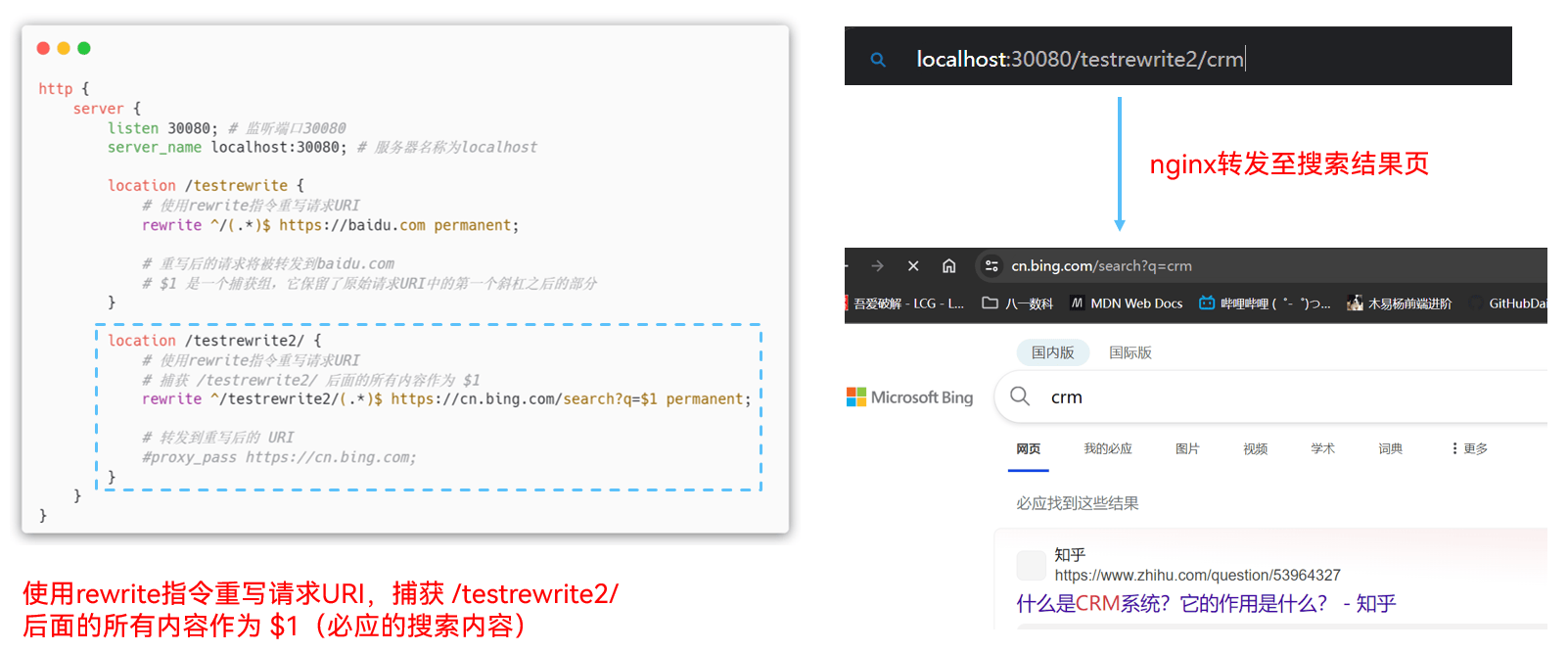 location /testrewrite2/ { rewrite ^/testrewrite2/(.*)$ https://cn.bing.com/search?q=$1 permanent; }