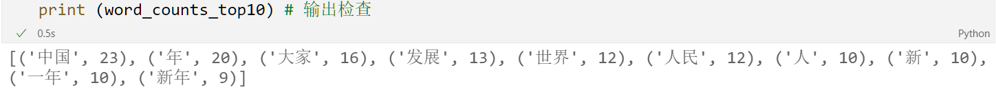 这里使用了哈工大的停词表清洗text中的无用词汇,排除中文无用虚词"了"的词汇的影响,利用collections库一行代码完成词频统计,并输出词频前十的词条。