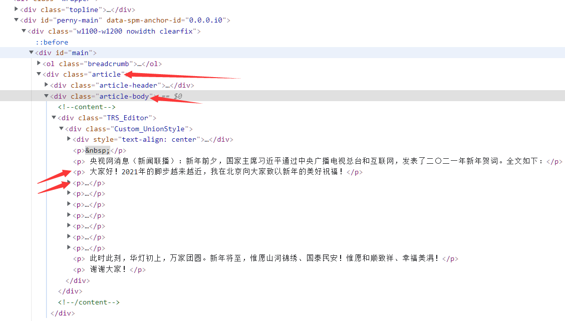 近三年来,网站的内容均在类名为article-body的div盒子下,且均为p标签(只有2022年的文章内容给予p标签样式,不通用)