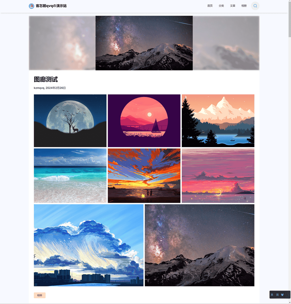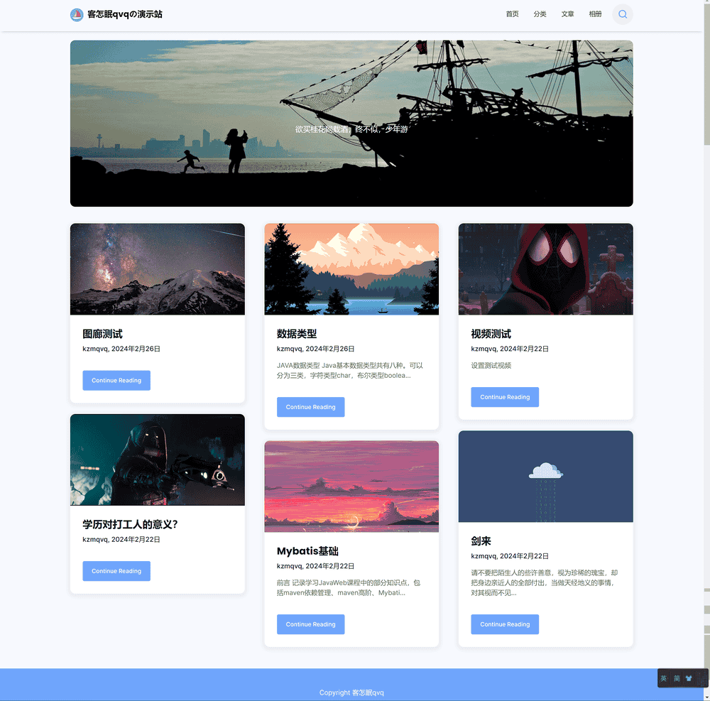 启用顶部图、禁用侧栏、修改顶部图样式、修改页脚的背景色及内容、设置layout的文章为三列,效果如下: